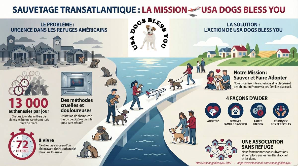 USA Dogs Bless You est une association de protection animale loi 1901 à but non lucratif reconnue d'intérêt général, créée en janvier 2014. Notre mission est de sauver de l’euthanasie des chiens, pourtant en bonne santé, placés dans des refuges ou des fourrières surpeuplés principalement dans le sud des Etats-Unis. En effet, si les chiens ne trouvent pas de nouveaux propriétaires, ils sont condamnés à une mort fatale, douloureuse et longue !