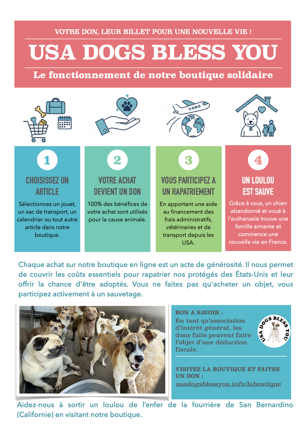 USA Dogs Bless You n’est pas un refuge. Nous ne disposons ni de subventions, ni de locaux. Le prix demandé pour une adoption couvre une grande partie de nos frais.