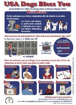 USA Dogs Bless You est une association de protection animale loi 1901 à but non lucratif reconnue d'intérêt général, créée en janvier 2014. Notre mission est de sauver de l’euthanasie des chiens, pourtant en bonne santé, placés dans des refuges ou des fourrières surpeuplés principalement dans le sud des Etats-Unis. En effet, si les chiens ne trouvent pas de nouveaux propriétaires, ils sont condamnés à une mort fatale, douloureuse et longue !